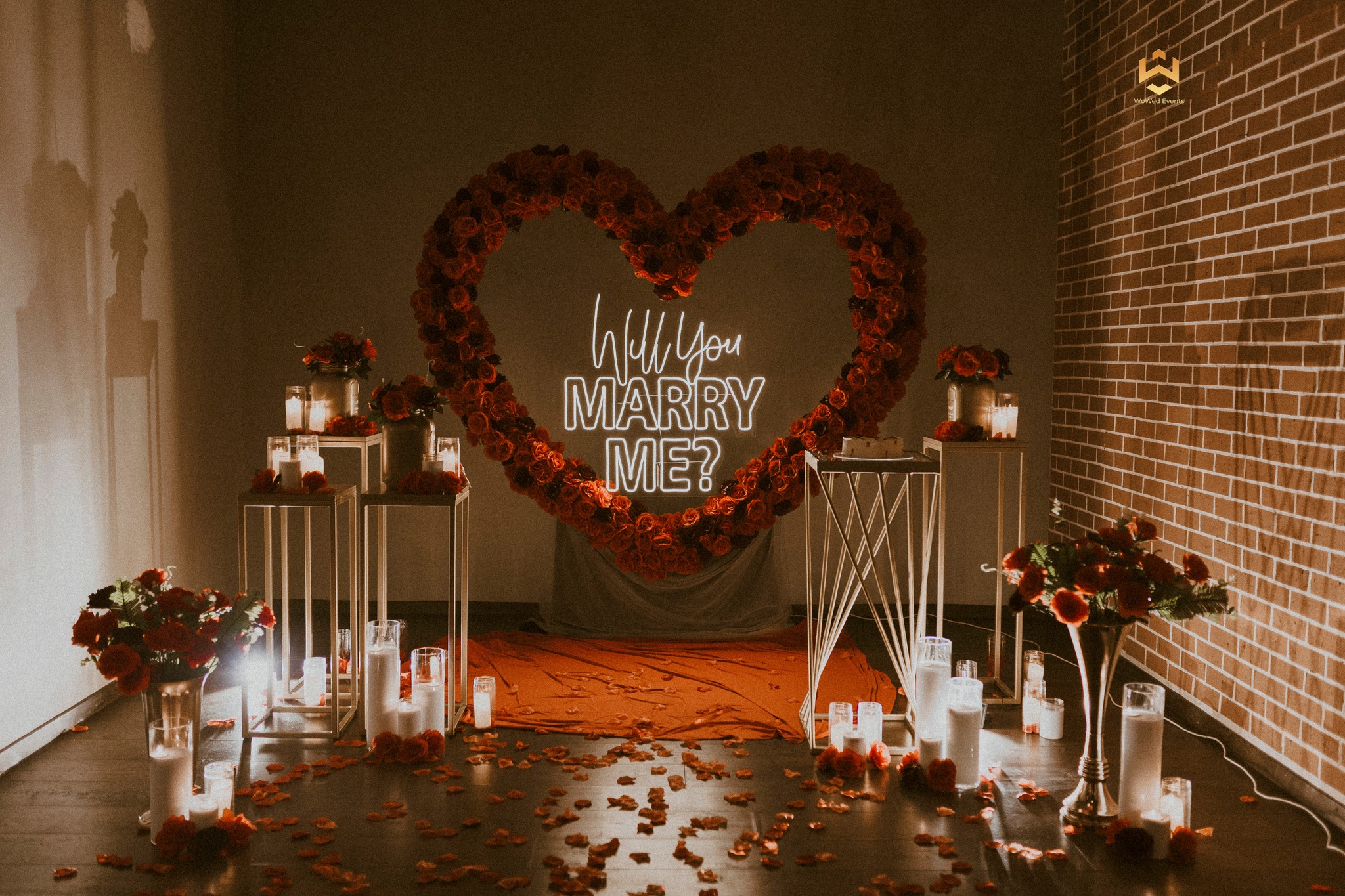 Create the perfect “Yes” moment.Choose from intimate indoor setups to outdoor romantic scenes with floral arches, candles, and neon signage.
